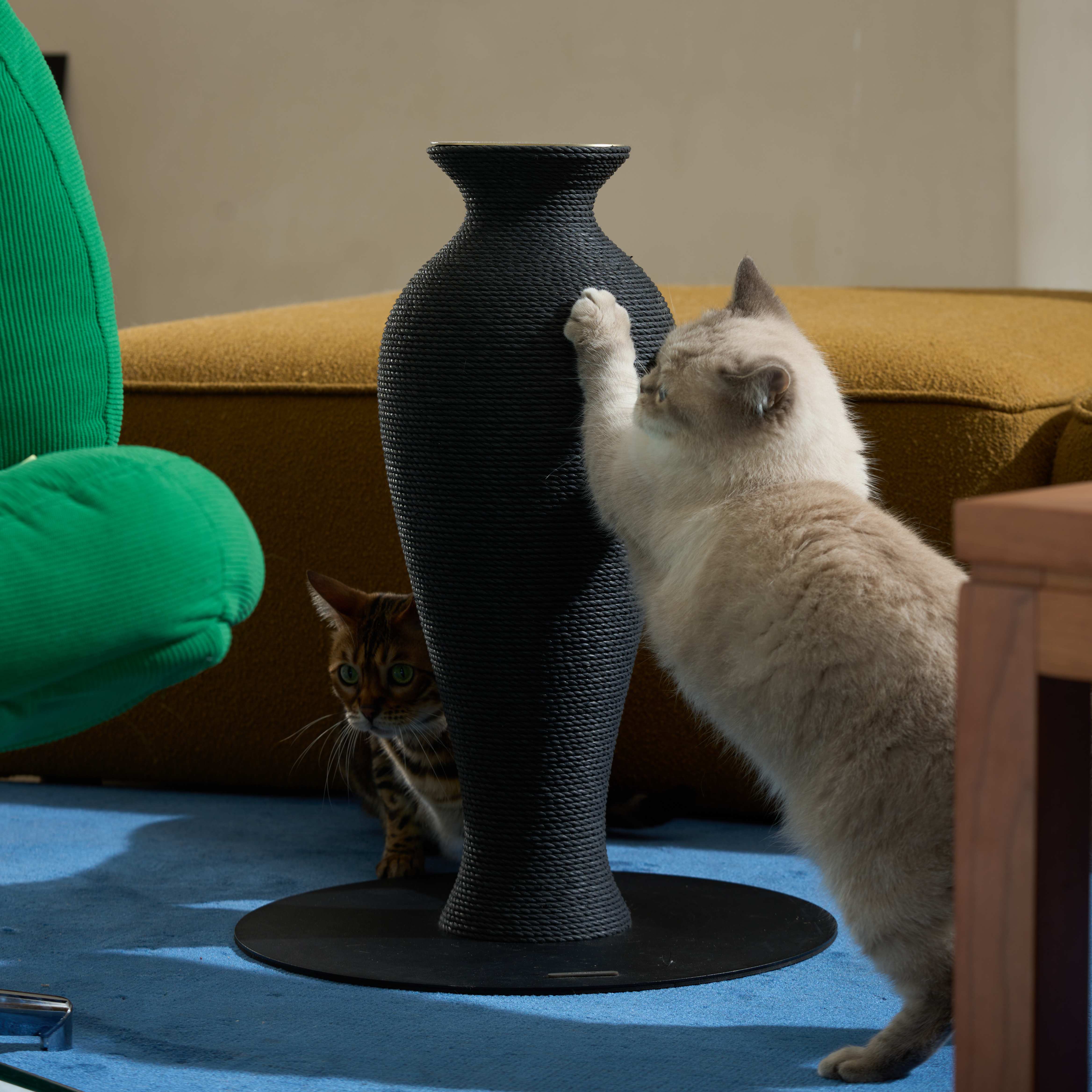For the cat who stretches against every door frame. Stilt's slim, tall silhouette gives long-bodied cats the full vertical pull they crave. The curved waist creates a natural grip point — stand, dig in, stretch out.